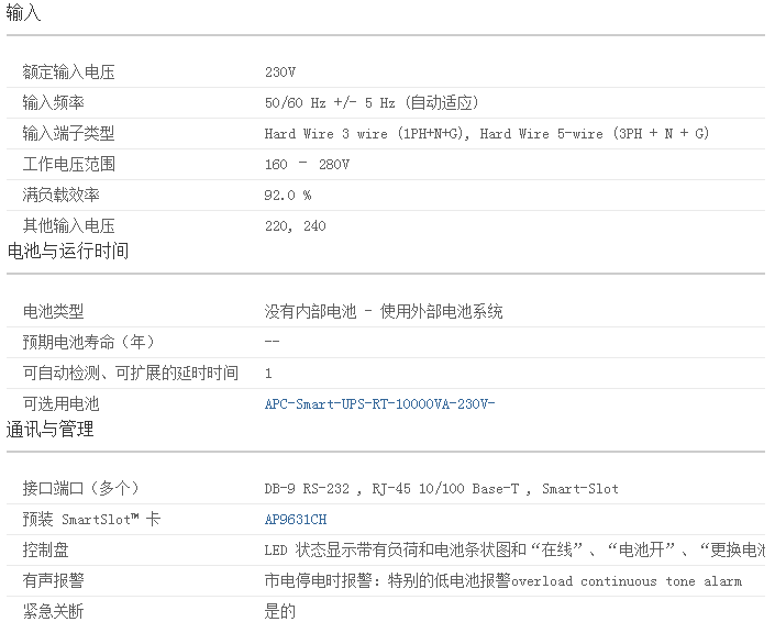 斷開電池通知當(dāng)電池不能提供后備電力時(shí)警告有聲報(bào)警提供改變市電和UPS電源條件的通知自動(dòng)自檢定期自檢電池,確保及早檢測出需要更換的電池。可預(yù)測的故障通知提供的早期警報(bào)故障分析確保了部件及時(shí)更換用戶可更換電池能夠簡單升級和更換電池