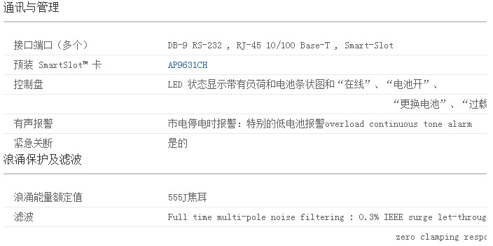 安全機(jī)構(gòu)的測(cè)試和認(rèn)證意味著您可以部署Smart-UPS,并且確信它們能夠符合或超過(guò)業(yè)界嚴(yán)格的標(biāo)準(zhǔn)。通過(guò)容易、方便的遠(yuǎn)程訪問(wèn)能力來(lái)節(jié)省時(shí)間。通過(guò)串口、USB或可選的以太網(wǎng)進(jìn)行網(wǎng)絡(luò)管理。包括PowerChute?網(wǎng)絡(luò)關(guān)機(jī)軟件,可實(shí)現(xiàn)方便的監(jiān)視和控制、安全的操作系統(tǒng)關(guān)機(jī)以及創(chuàng)新的能源管理功能。Avoids costly power problems by keeping your IT equipment data protected available.網(wǎng)絡(luò)級(jí)電源調(diào)節(jié)功能可防止浪涌的危害和破壞性的噪音。雙轉(zhuǎn)換架構(gòu)可提供嚴(yán)格的電壓調(diào)節(jié)、頻率調(diào)節(jié)、以及出現(xiàn)電力事故時(shí)轉(zhuǎn)換到電池的零轉(zhuǎn)換時(shí)間。Low operating maintenance costs with proven reliability intelligent battery management.由APC公司首創(chuàng)的智能電池管理可通過(guò)智能化、準(zhǔn)確的溫度補(bǔ)償充電來(lái)提高電池的性能并延長(zhǎng)其壽命。自動(dòng)自檢確保了電池的可靠性并可在更換電池前向用戶發(fā)出警告。方便、易于連接、可熱插拔的電池模塊使得無(wú)需斷電就能進(jìn)行電池更換。